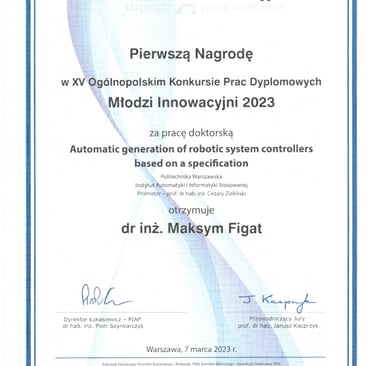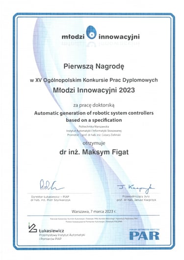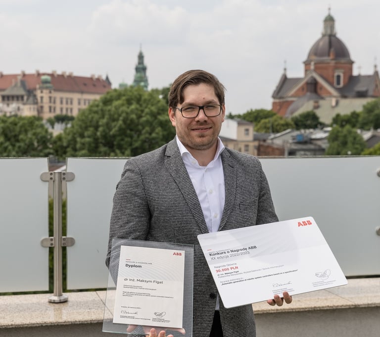 We are pleased to announce that Dr Maksym Figat has won the Grand Prize in the 20th edition of the ABB Prize competition. The winning work entitled "Automatic generation of robot system controllers based on a specification", https://www.elka.pw.edu.pl/Aktualnosci/Nominacje-i-nagrody/Dr-inz.-Maksym-Figat-zwyciezca-Konkursu-o-Nagrode-ABB