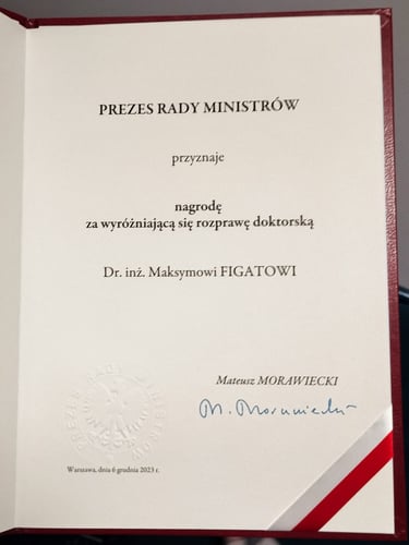 2023 – Laureate of the first award for the best doctoral thesis in XVth National Competition “Young Innovators”, Łukasiewicz Research Network - PIAP Institute, Poland,